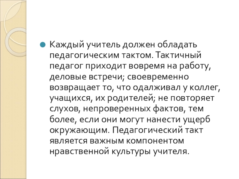 работу, деловые встречи; своевременно возвращает то, что одалживал у коллег, учащихся, их родителей; не повторяет слухов, непроверенных фактов, тем более, если они могут нанести ущерб окружающим. Педагогический такт является важным компонентом нравственной культуры учителя.