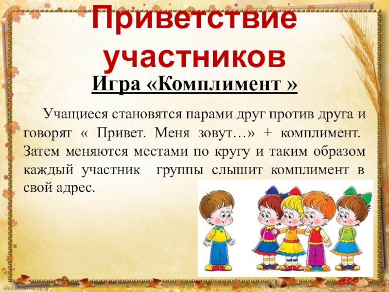 « Привет. Меня зовут…» + комплимент. Затем меняются местами по кругу и таким образом каждый участник группы слышит комплимент в свой адрес.