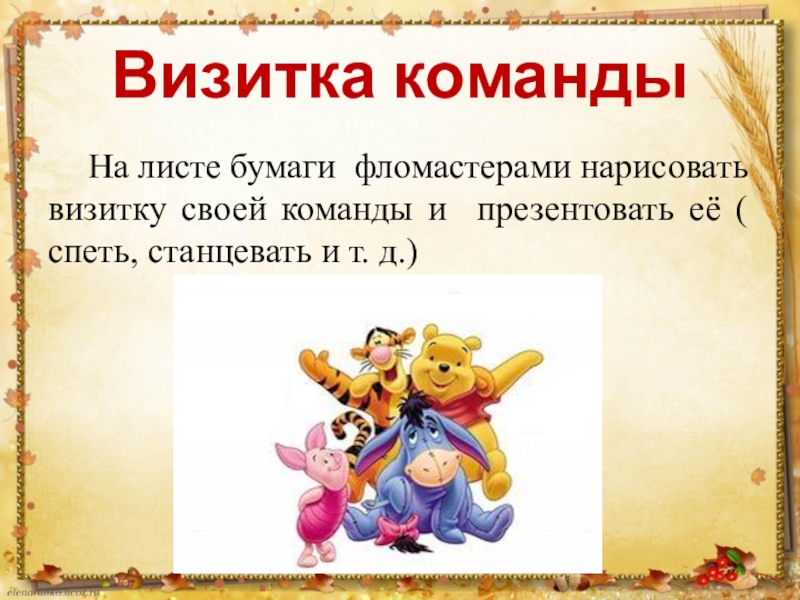 На листе бумаги фломастерами нарисовать визитку своей команды и презентовать