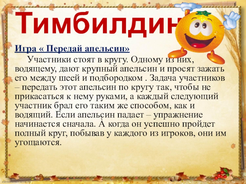 дают крупный апельсин и просят зажать его между шеей и подбородком . Задача участников – передать этот апельсин по кругу так, чтобы не прикасаться к нему руками, а каждый следующий участник брал его таким же способом, как и водящий. Если апельсин падает – упражнение начинается сначала. À когда он успешно пройдет полный круг, побывав у каждого из игроков, они им угощаются.