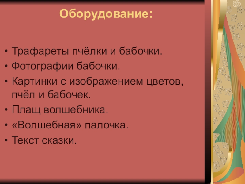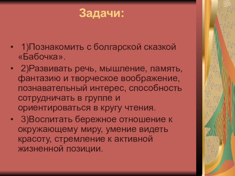 1)Познакомить с болгарской сказкой «Бабочка».