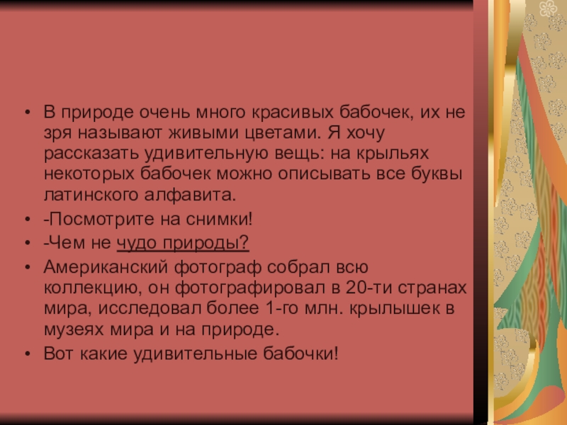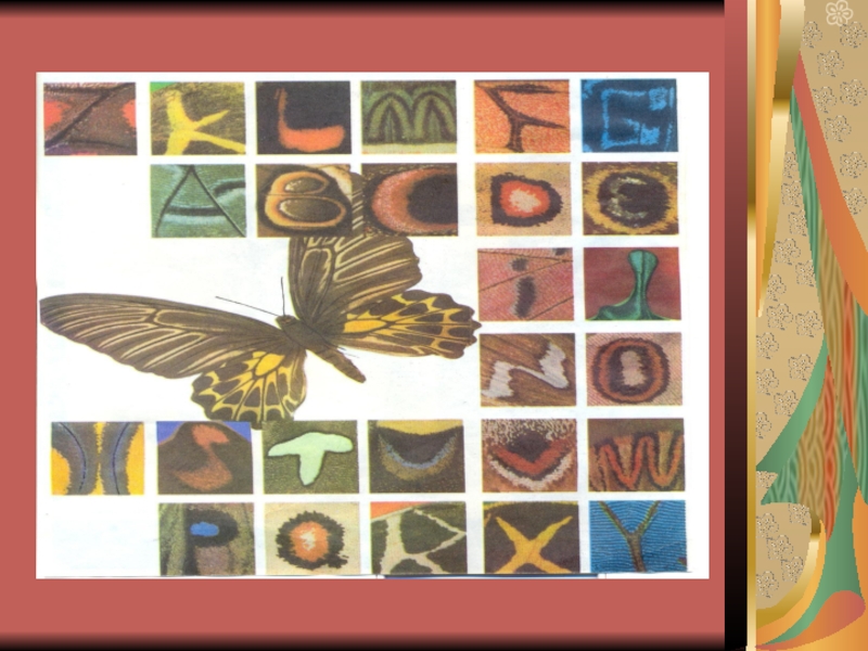 живыми цветами. Я хочу рассказать удивительную вещь: на крыльях некоторых бабочек можно описывать все буквы латинского алфавита.