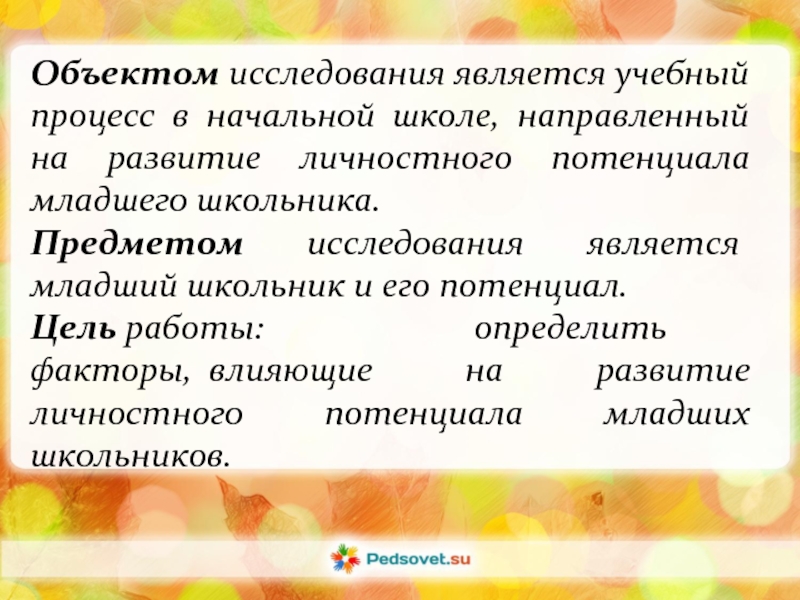 Объектом исследования является учебный процесс в начальной школе, направленный на развитие личностного потенциала младшего школьника.Предметом исследования является