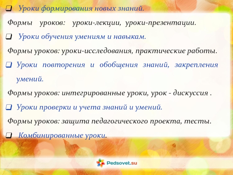 Уроки формирования новых знаний.Формы  уроков:  уроки-лекции, уроки-презентации. Уроки обучения умениям и навыкам.Формы уроков: уроки-исследования,