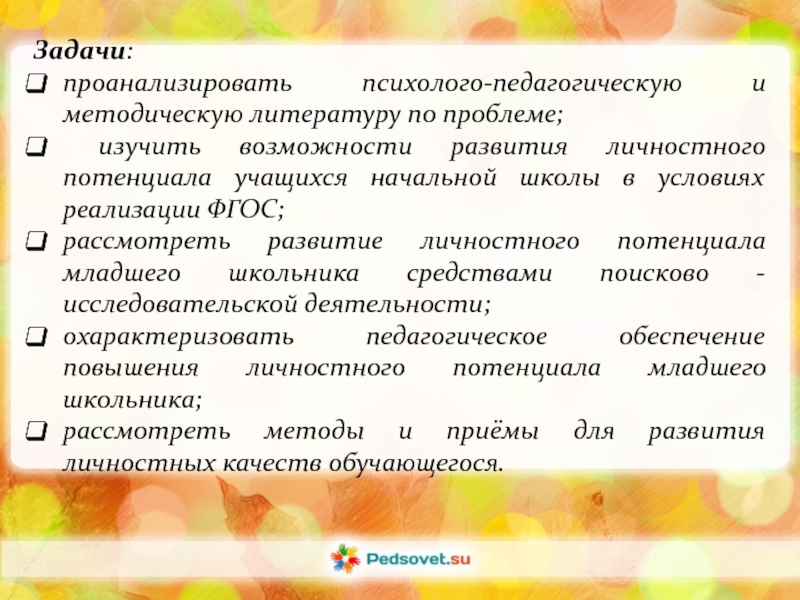 Задачи:проанализировать психолого-педагогическую и методическую литературу по проблеме; изучить возможности развития личностного потенциала учащихся начальной школы в условиях