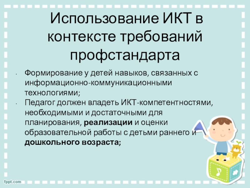 Использование ИКТ в контексте требований профстандартаФормирование у детей навыков, связанных с информационно-коммуникационными технологиями;Педагог должен владеть ИКТ-компетентностями,