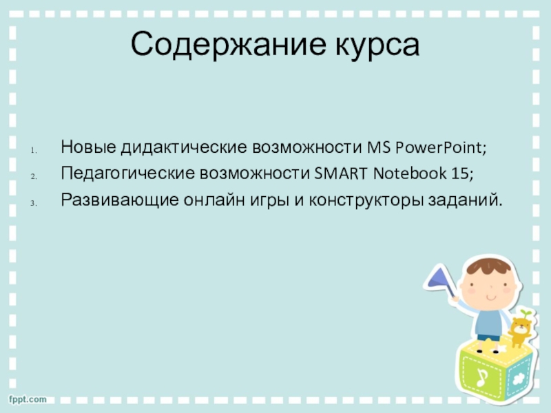 Содержание курсаНовые дидактические возможности MS PowerPoint; Педагогические возможности SMART Notebook 15;Развивающие онлайн игры и конструкторы заданий.