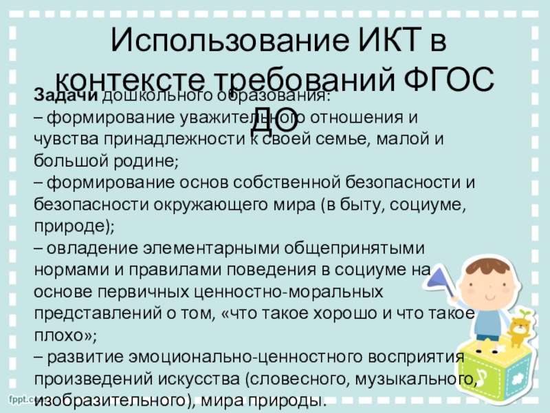 Использование ИКТ в контексте требований ФГОС ДОЗадачи дошкольного образования:– формирование уважительного отношения и чувства принадлежности к