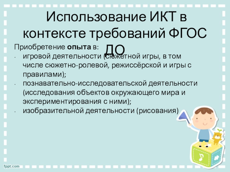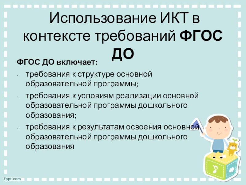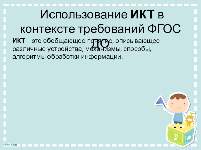 Использование ИКТ в контексте требований ФГОС ДОИКТ – это обобщающее понятие, описывающее различные устройства, механизмы, способы, алгоритмы обработки информации.