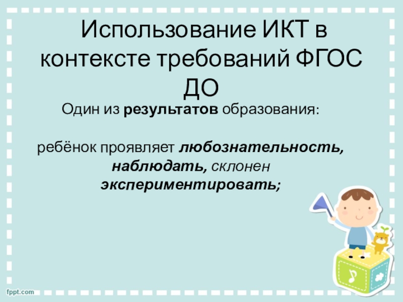 Использование ИКТ в контексте требований ФГОС ДООдин из результатов образования: ребёнок проявляет любознательность, наблюдать, склонен экспериментировать;