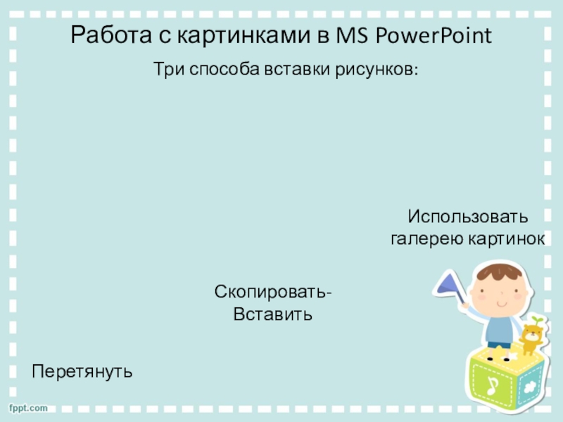 Работа с картинками в MS PowerPointТри способа вставки рисунков:ПеретянутьСкопировать-ВставитьИспользовать галерею картинок