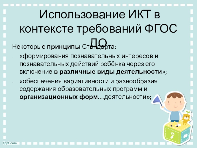 Использование ИКТ в контексте требований ФГОС ДОНекоторые принципы Стандарта:«формирования познавательных интересов и познавательных действий ребёнка через