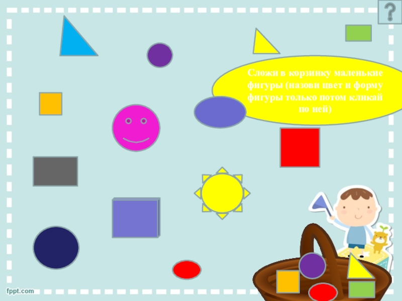 Сложи в корзинку маленькие фигуры (назови цвет и форму фигуры только потом кликай по ней)