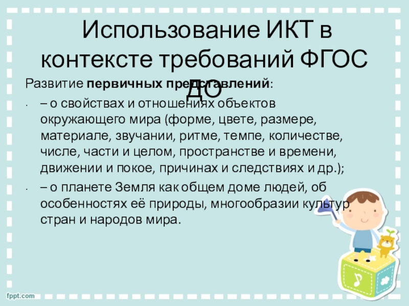 Использование ИКТ в контексте требований ФГОС ДОРазвитие первичных представлений: – о свойствах и отношениях объектов окружающего