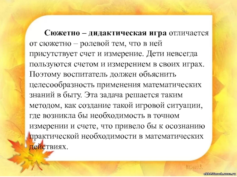 Необходимое условие для успешности проведения сюжетно-дидактической игры – непосредственное участие в игре воспитателя, выполняющего в игре игровую роль, так как в ходе игры необходим контроль за правильным выполнением счетно-измерительных действий во избежание закрепления ошибок.