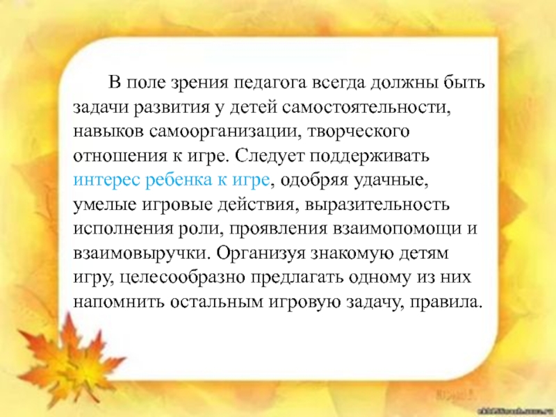 всегда должны быть задачи развития у детей самостоятельности, навыков самоорганизации, творческого отношения к игре. Следует поддерживать интерес ребенка к игре, одобряя удачные, умелые игровые действия, выразительность исполнения роли, проявления взаимопомощи и взаимовыручки. Организуя знакомую детям игру, целесообразно предлагать одному из них напомнить остальным игровую задачу, правила.