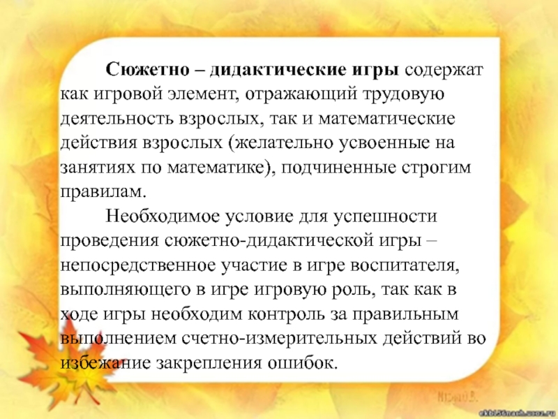 дидактические игры содержат как игровой элемент, отражающий трудовую деятельность взрослых, так и математические действия взрослых (желательно усвоенные на занятиях по математике), подчиненные строгим правилам.