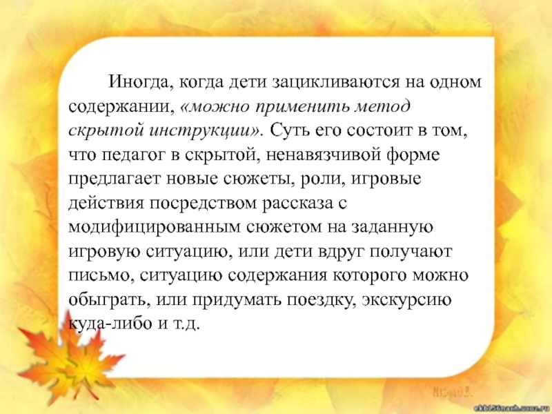 зацикливаются на одном содержании, «можно применить метод скрытой инструкции». Суть его состоит в том, что педагог в скрытой, ненавязчивой форме предлагает новые сюжеты, роли, игровые действия посредством рассказа с модифицированным сюжетом на заданную игровую ситуацию, или дети вдруг получают письмо, ситуацию содержания которого можно обыграть, или придумать поездку, экскурсию куда-либо и т.д.