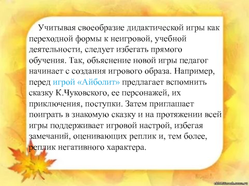 учебной деятельности, следует избегать прямого обучения. Так, объяснение новой игры педагог начинает с создания игрового образа. Например, перед игрой «Айболит» предлагает вспомнить сказку К.Чуковского, ее персонажей, их приключения, поступки. Затем приглашает поиграть в знакомую сказку и на протяжении всей игры поддерживает игровой настрой, избегая замечаний, оценивающих реплик и, тем более, реплик негативного характера.