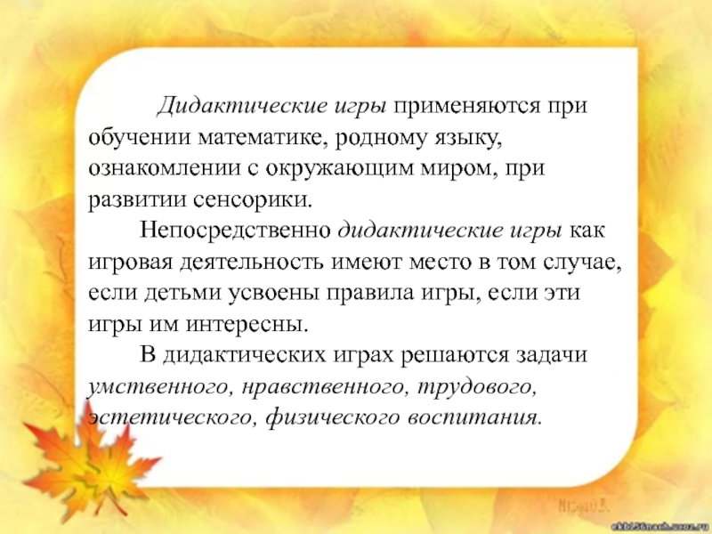 В дидактических играх решаются задачи умственного, нравственного, трудового, эстетического, физического воспитания.