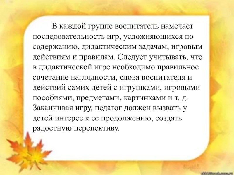 игр, усложняющихся по содержанию, дидактическим задачам, игровым действиям и правилам. Следует учитывать, что в дидактической игре необходимо правильное сочетание наглядности, слова воспитателя и действий самих детей с игрушками, игровыми пособиями, предметами, картинками и т. д. Заканчивая игру, педагог должен вызвать у детей интерес к ее продолжению, создать радостную перспективу.