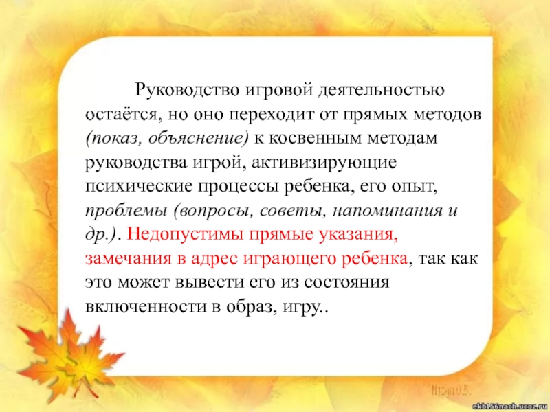 но оно переходит от прямых методов (показ, объяснение) к косвенным методам руководства игрой, активизирующие психические процессы ребенка, его опыт, проблемы (вопросы, советы, напоминания и др.). Недопустимы прямые указания, замечания в адрес играющего ребенка, так как это может вывести его из состояния включенности в образ, игру..