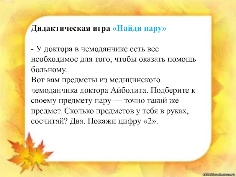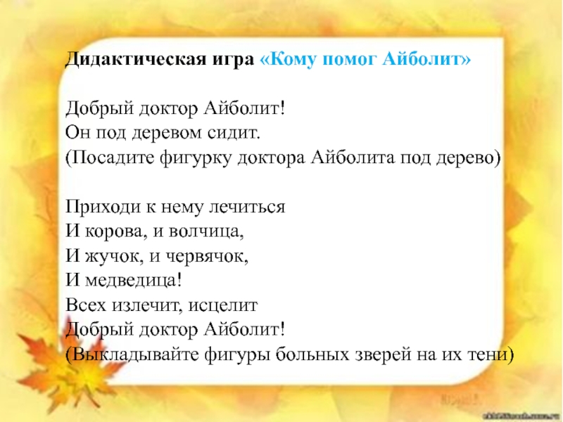 Слайд 26Дидактическая игра «Кому помог Айболит»