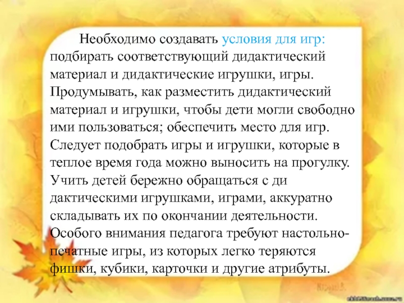 дидактический материал и дидактические игрушки, игры. Продумывать, как разместить дидактический материал и игрушки, чтобы дети могли свободно ими пользоваться; обеспечить место для игр. Следует подобрать игры и игрушки, которые в теплое время года можно выносить на прогулку. Учить детей бережно обращаться с дидактическими игрушками, играми, аккуратно складывать их по окончании деятельности. Особого внимания педагога требуют настольно-печатные игры, из которых легко теряются фишки, кубики, карточки и другие атрибуты.