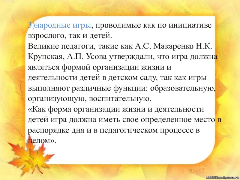 такие как А.С. Макаренко Н.К. Крупская, А.П. Усова утверждали, что игра должна являться формой организации жизни и деятельности детей в детском саду, так как игры выполняют различные функции: образовательную, организующую, воспитательную.