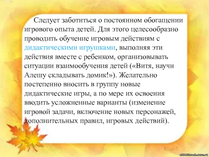 Для этого целесообразно проводить обучение игровым действиям с дидактическими игрушками, выполняя эти действия вместе с ребенком, организовывать ситуации взаимообучения детей («Витя, научи Алешу складывать домик!»). Желательно постепенно вносить в группу новые дидактические игры, а по мере их освоения вводить усложненные варианты (изменение игровой задачи, включение новых персонажей, дополнительных правил, игровых действий).