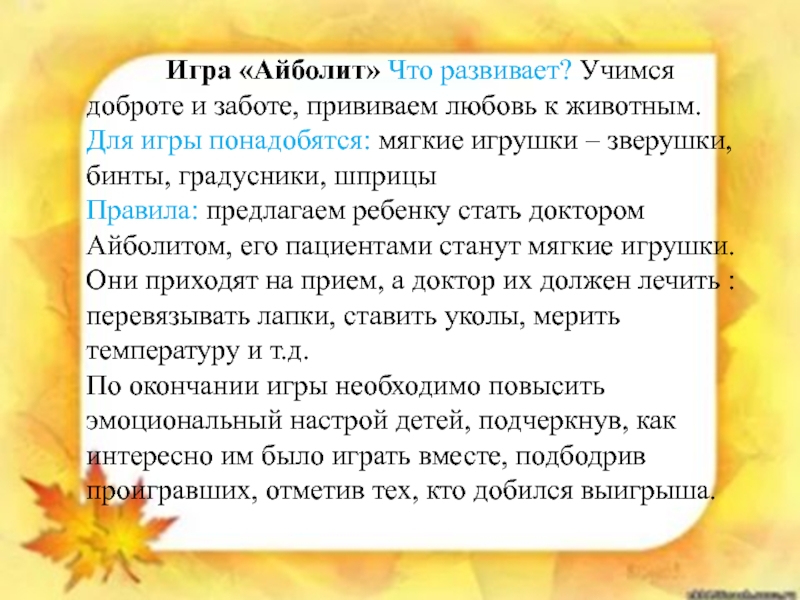 Слайд 29 Игра «Айболит» Что развивает? Учимся