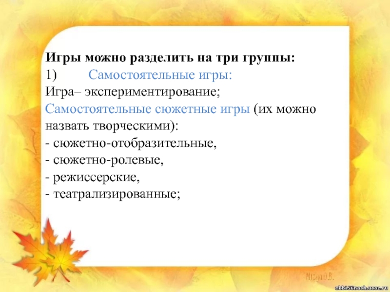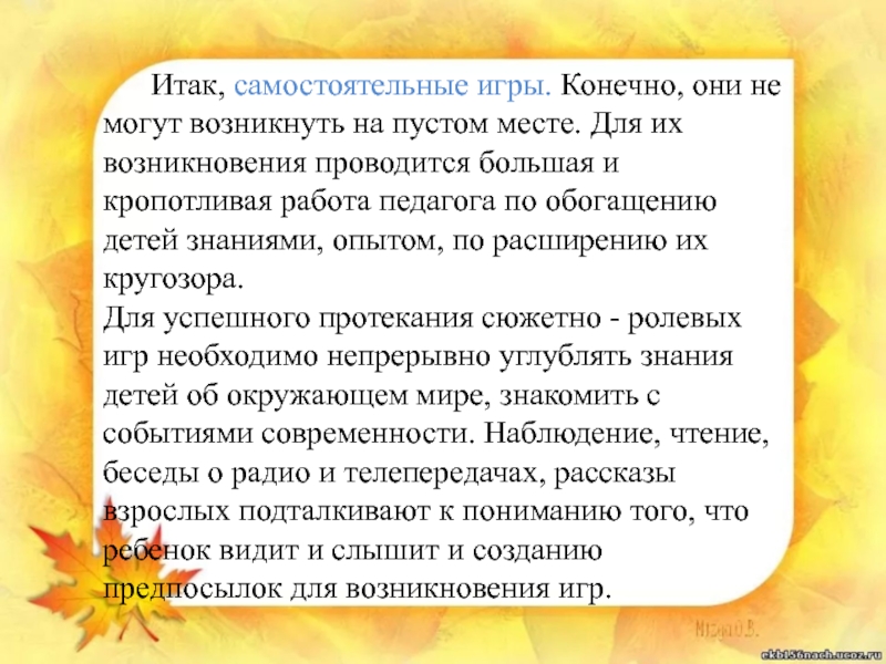 Слайд 8 Итак, самостоятельные игры. Конечно, они не могут возникнуть