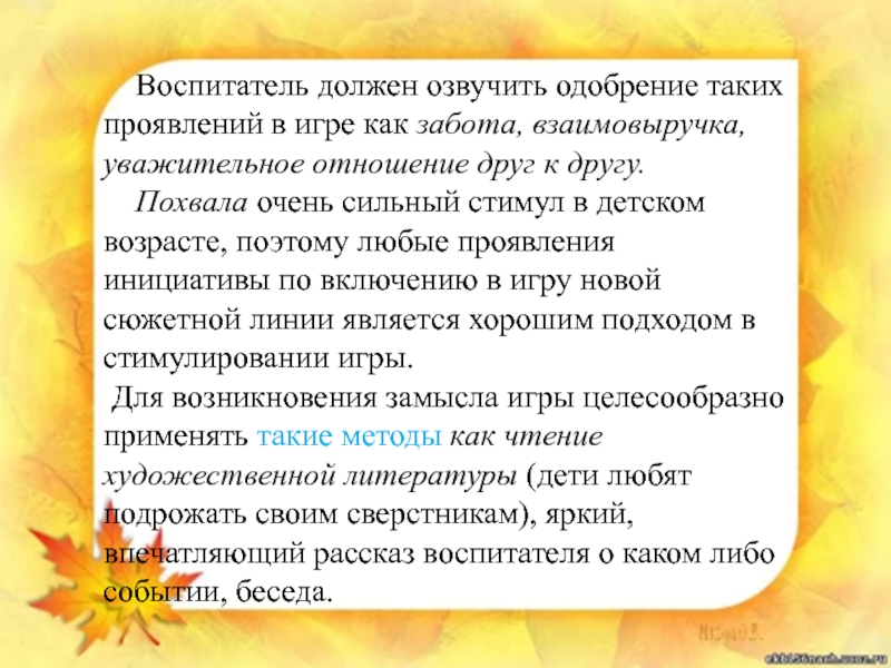 Слайд 15 Воспитатель должен озвучить одобрение таких проявлений в игре как