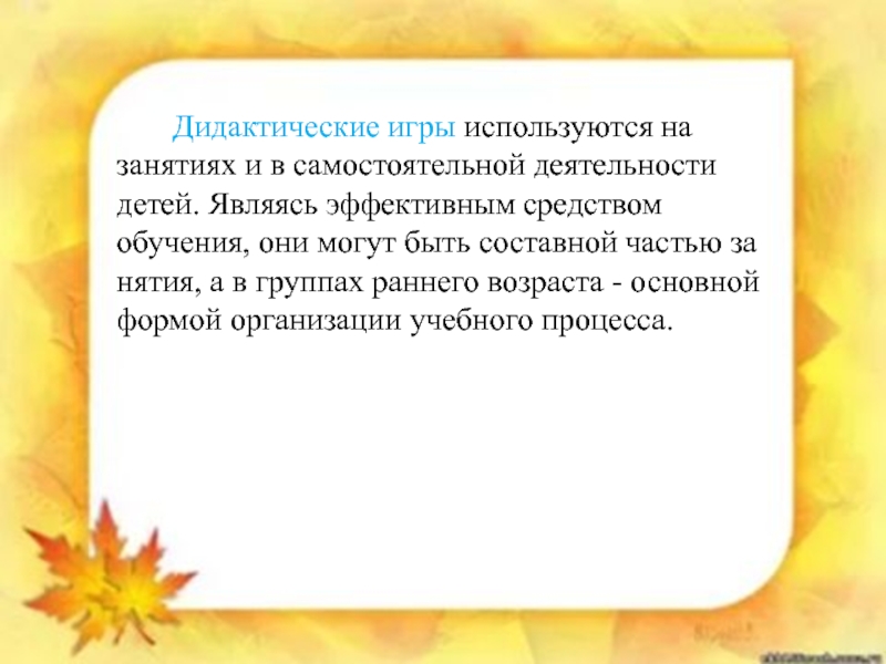 самостоятельной деятельности детей. Являясь эффективным средством обучения, они могут быть составной частью занятия, а в группах раннего возраста - основной формой организации учебного процесса.