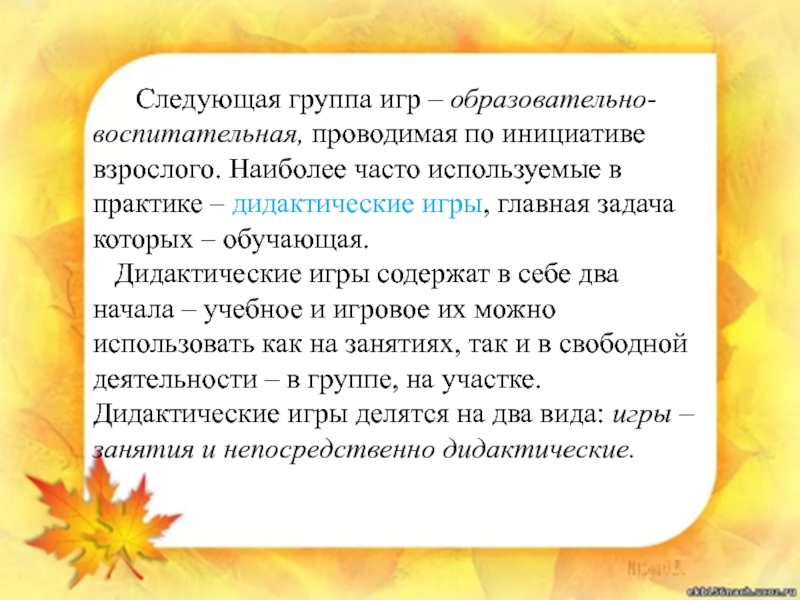 Дидактические игры содержат в себе два начала – учебное и игровое их можно использовать как на занятиях, так и в свободной деятельности – в группе, на участке. Дидактические игры делятся на два вида: игры – занятия и непосредственно дидактические.