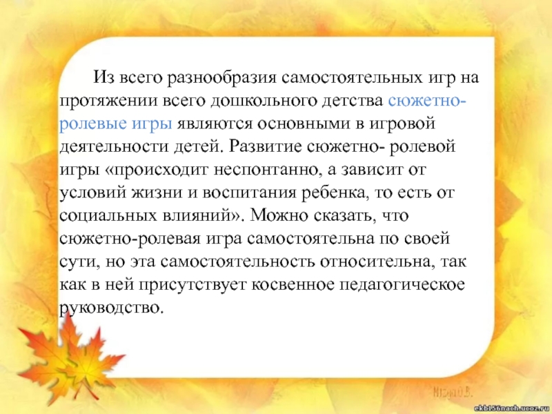 разнообразия самостоятельных игр на протяжении всего дошкольного детства сюжетно-ролевые игры являются основными в игровой деятельности детей. Развитие сюжетно- ролевой игры «происходит неспонтанно, а зависит от условий жизни и воспитания ребенка, то есть от социальных влияний». Можно сказать, что сюжетно-ролевая игра самостоятельна по своей сути, но эта самостоятельность относительна, так как в ней присутствует косвенное педагогическое руководство.