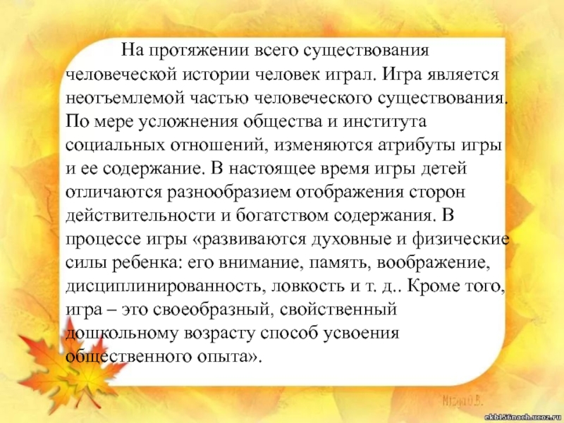 истории человек играл. Игра является неотъемлемой частью человеческого существования. По мере усложнения общества и института социальных отношений, изменяются атрибуты игры и ее содержание. В настоящее время игры детей отличаются разнообразием отображения сторон действительности и богатством содержания. В процессе игры «развиваются духовные и физические силы ребенка: его внимание, память, воображение, дисциплинированность, ловкость и т. д.. Кроме того, игра – это своеобразный, свойственный дошкольному возрасту способ усвоения общественного опыта».