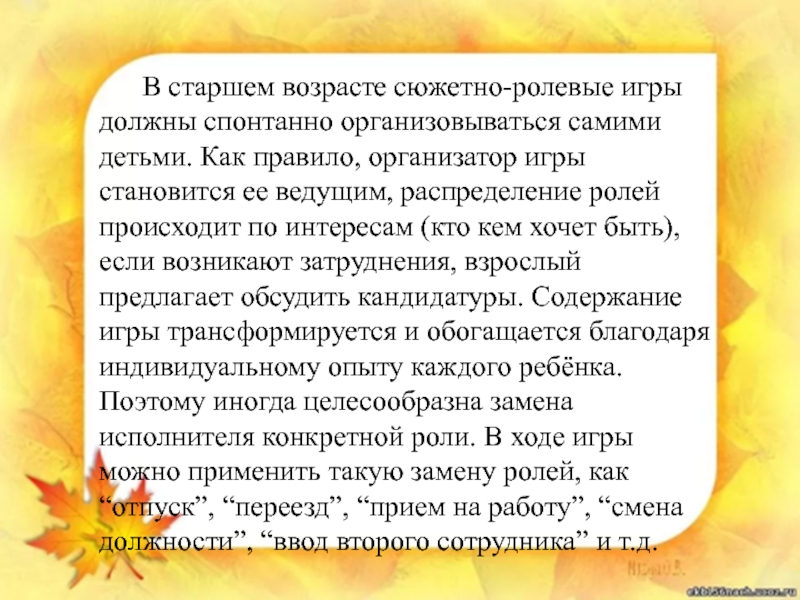 самими детьми. Как правило, организатор игры становится ее ведущим, распределение ролей происходит по интересам (кто кем хочет быть), если возникают затруднения, взрослый предлагает обсудить кандидатуры. Содержание игры трансформируется и обогащается благодаря индивидуальному опыту каждого ребёнка. Поэтому иногда целесообразна замена исполнителя конкретной роли. В ходе игры можно применить такую замену ролей, как “отпуск”, “переезд”, “прием на работу”, “смена должности”, “ввод второго сотрудника” и т.д.
