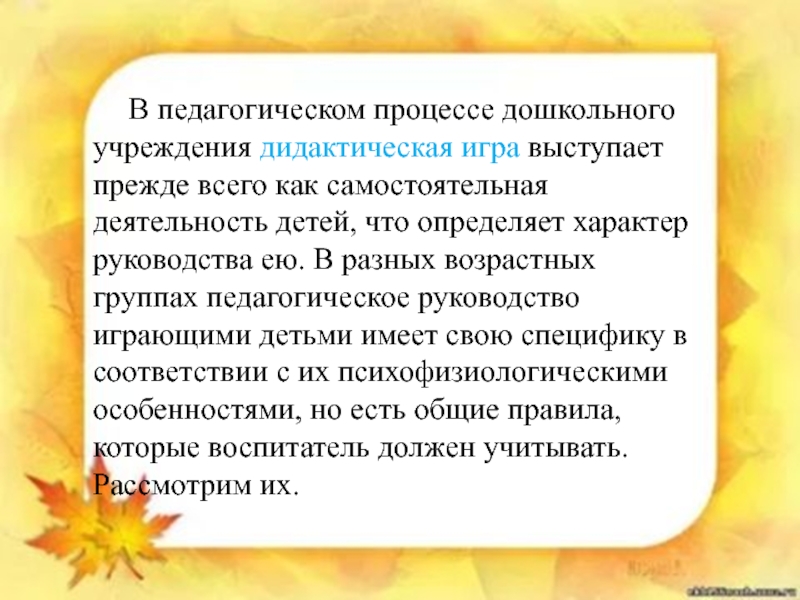 прежде всего как самостоятельная деятельность детей, что определяет характер руководства ею. В разных возрастных группах педагогическое руководство играющими детьми имеет свою специфику в соответствии с их психофизиологическими особенностями, но есть общие правила, которые воспитатель должен учитывать. Рассмотрим их.
