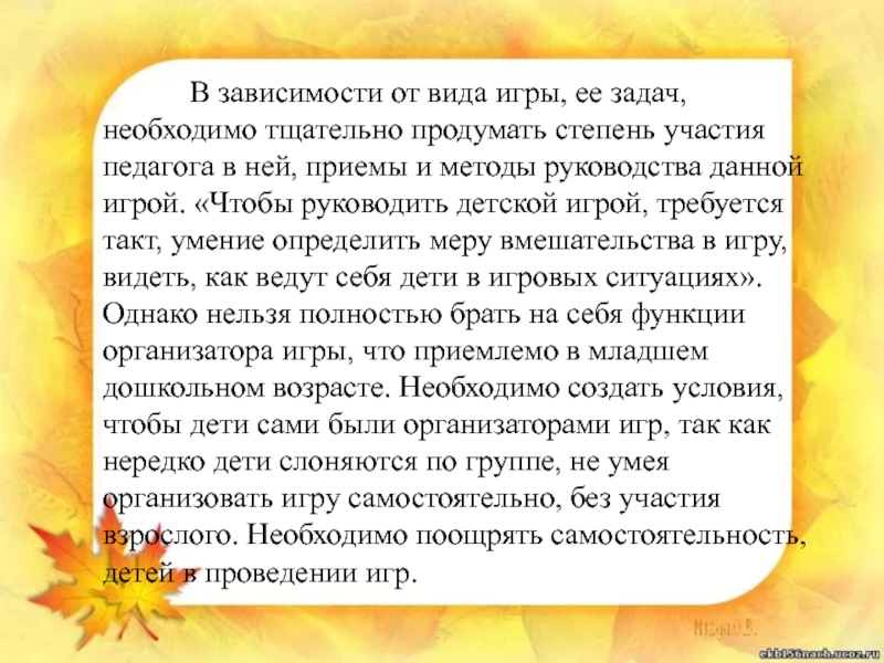 либо другой деятельности. К детским играм необходимо подходить очень серьезно, внимательно следить за ходом игры и стараться не упускать возможность для образовательно-воспитательной работы в процессе игры.