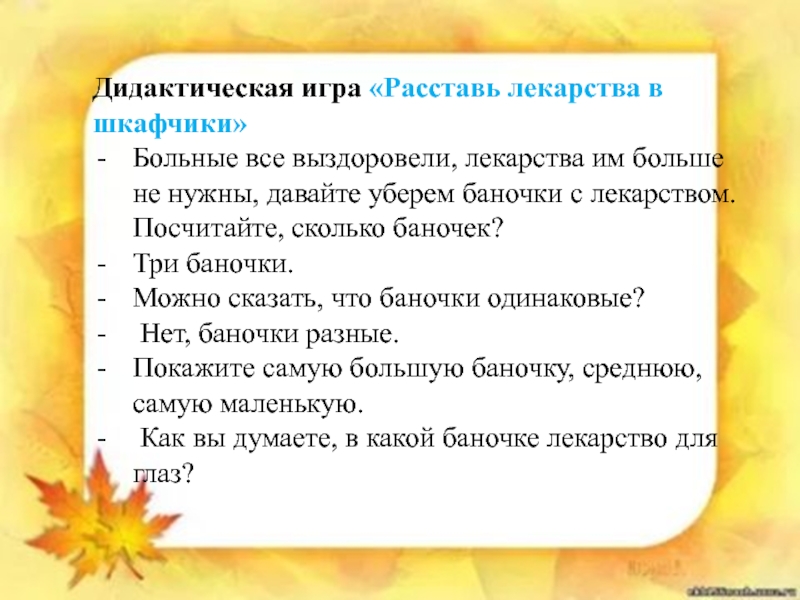 Слайд 31Дидактическая игра «Расставь лекарства в шкафчики»
