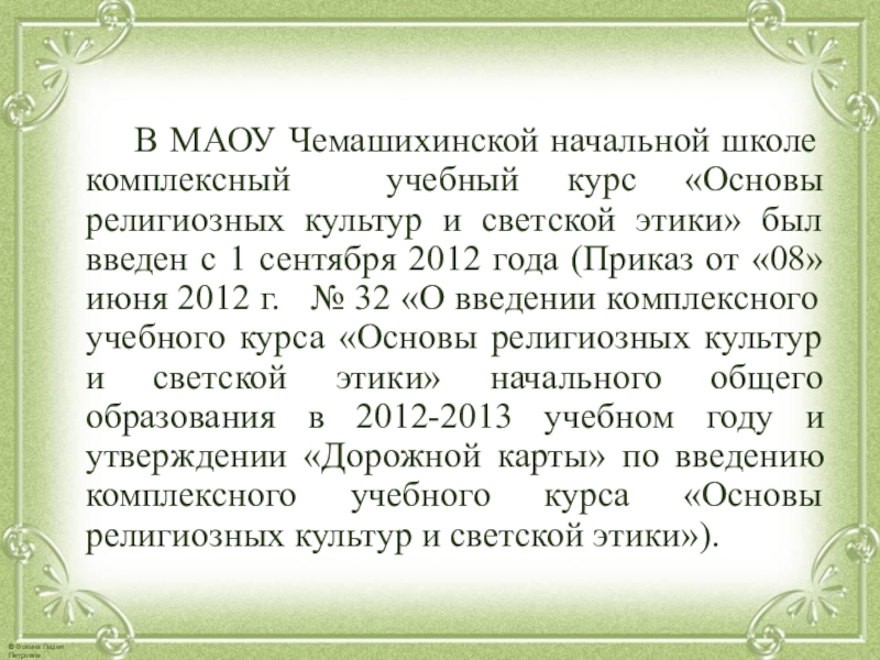 курс «Основы религиозных культур и светской этики» был введен с 1 сентября 2012 года (Приказ от «08» июня 2012 г. № 32 «О введении комплексного учебного курса «Основы религиозных культур и светской этики» начального общего образования в 2012-2013 учебном году и утверждении «Дорожной карты» по введению комплексного учебного курса «Основы религиозных культур и светской этики»).