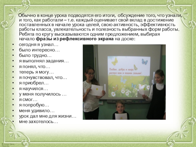того, что узнали, и того, как работали – т.е. каждый оценивает свой вклад в достижение поставленных в начале урока целей, свою активность, эффективность работы класса, увлекательность и полезность выбранных форм работы. Ребята по кругу высказываются одним предложением, выбирая начало фразы из рефлексивного экрана на доске: