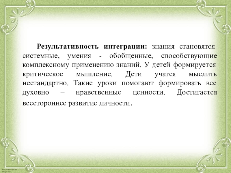 Слайд 19 Результативность интеграции: знания становятся системные, умения - обобщенные,