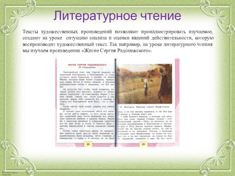 анализа и оценки явлений действительности, которую воспроизводит художественный текст. Так например, на уроке литературного чтения мы изучаем произведение «Житие Сергия Радонежского».