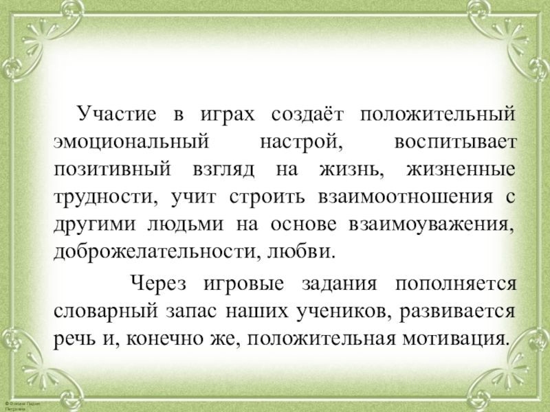 Слайд 28 Участие в играх создаёт положительный эмоциональный настрой, воспитывает позитивный