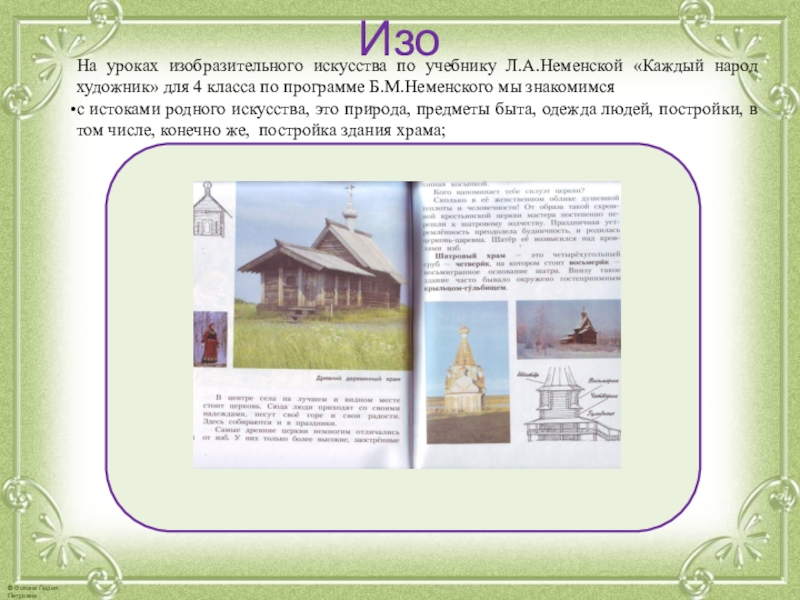 с истоками родного искусства, это природа, предметы быта, одежда людей, постройки, в том числе, конечно же, постройка здания храма;