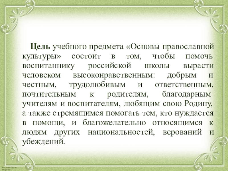 Слайд 4 Цель учебного предмета «Основы православной культуры» состоит
