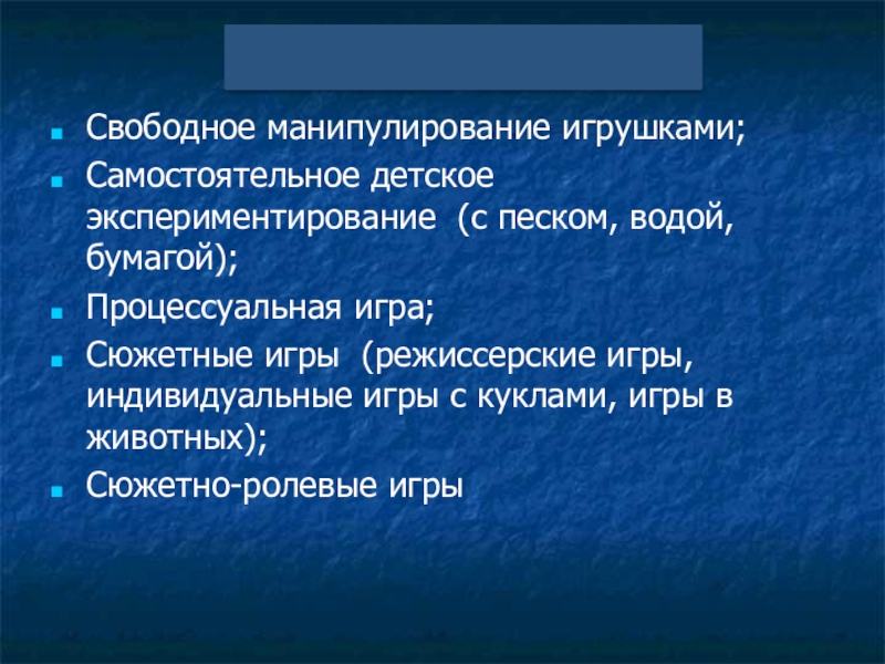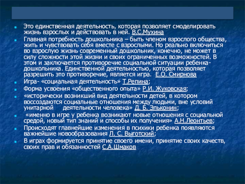 «исторически возникший вид деятельности детей, в котором воссоздаются социальные отношения между людьми, вне условий унитарной деятельности человека» Д. Б. Эльконин;