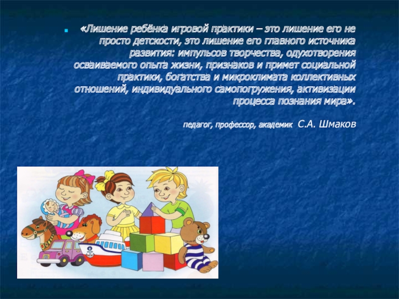 Слайд 2«Лишение ребёнка игровой практики – это лишение его не просто детскости,